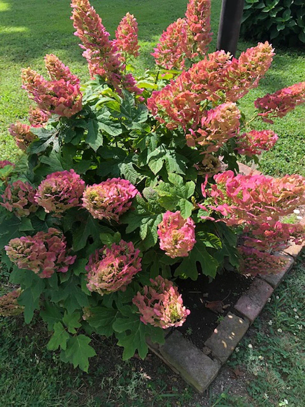 These hydrangeas are not always reliable bloomers, but the foliage alone is worth having them in your landscape. The fall color is a delightful maroon! The flowers are a conical white. The bark of the shrub gets a bit peel-y and interesting looking.